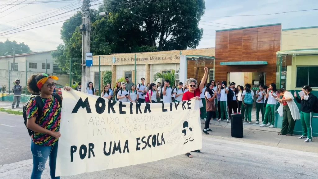 Professores, alunos e apoiadores da denúncia de assédio moral realizada por parte do corpo docente da Escola Estadual de Educação Profissional (EEEP) Professor Moreira de Sousa, em Juazeiro do Norte, realizaram na última terça-feira (29) uma manifestação em frente à escola para solicitar o afastamento da diretora e a instauração de uma investigação neutra sobre o caso.